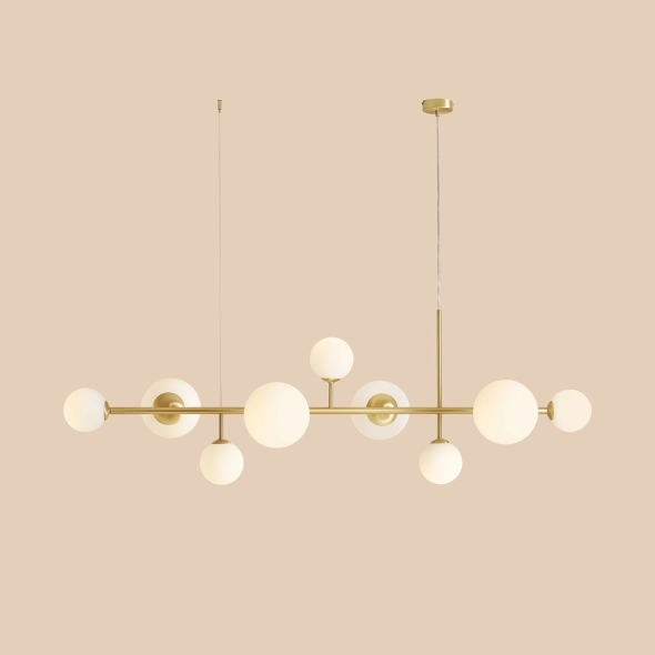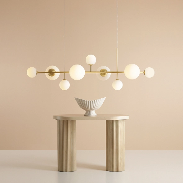Dione 9 Brass to nowoczesna i jednocześnie bardzo elegancka, rozłożysta lampa wisząca z naszej bestsellerowej kolekcji, tworząca wyjątkową atmosferę w pomieszczeniu. Niezwykle szeroka lampa - 170cm, z regulacją wysokości, świetnie sprawdzi się jako rozwiązanie nad duży, gościnny stół w salonie czy jadalni. Lampa posiada cztery matowe klosze o średnicy 20cm, wychodzące z boków oprawy oraz pięć mniejszych – 14cm, które sprawiają, że wydobywające się z niej światło pięknie rozprasza się we wnętrzu i nie jest spłaszczone.