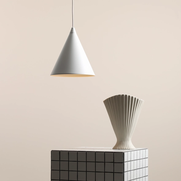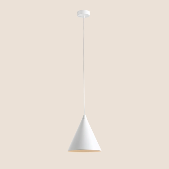 Pojedyncza, nowoczesna lampa wisząca Form White z kloszem w kształcie stożka, w białym, matowym wykończeniu. Przestrzenie nowoczesnych pokoi dziennych, jadalni, wysp kuchennych czy miejsc użyteczności publicznej wydają się dobrymi do zastosowania tej lampy.