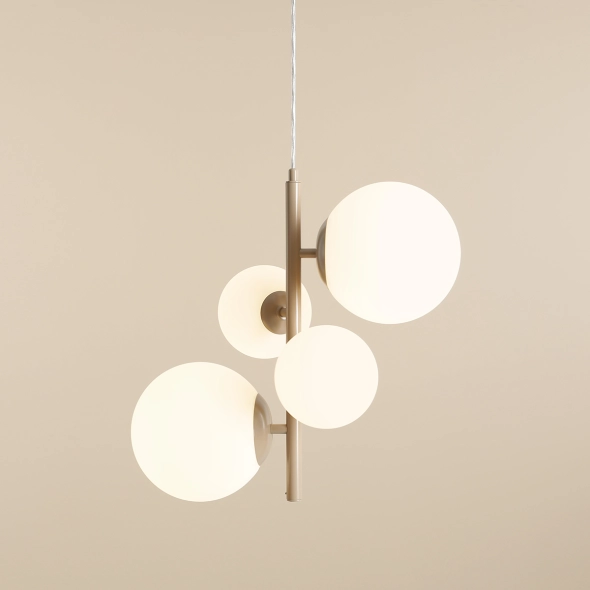 Nowoczesna lampa wisząca Bloom 4 Beige to modne i efektowne oświetlenie, dające przyjemne światło i niezapomniane wrażenie. Lampa, dzięki zastosowaniu czterech źródeł światła (matowe, białe klosze w dwóch rozmiarach: 14cm i 20cm) pięknie rozświetli przestrzeń, w której się znajduje. Polecamy do zawieszenia nad stołem. Lampa oprócz swojej funkcji będzie również dekoracją, wprowadzającą niepowtarzalny klimat.
