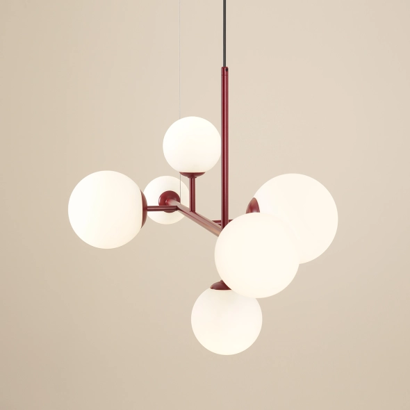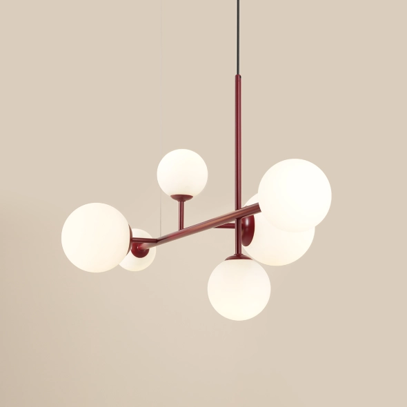 Bordowa lampa wisząca DIONE 6 RED WINE to nowa odsłona bestsellerowej kolekcji DIONE. Oprawa w wykończeniu głębokiego odcienia czerwonego wina efektownie kontrastuje z mlecznymi kloszami ze szkła z polskiej Huty Szkła. To elegancka propozycja dla miłośników nietuzinkowych wnętrz – lampa pięknie rozprasza światło, tworząc ciepły i nastrojowy klimat nad stołem w jadalni lub w salonie.
