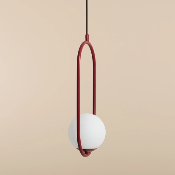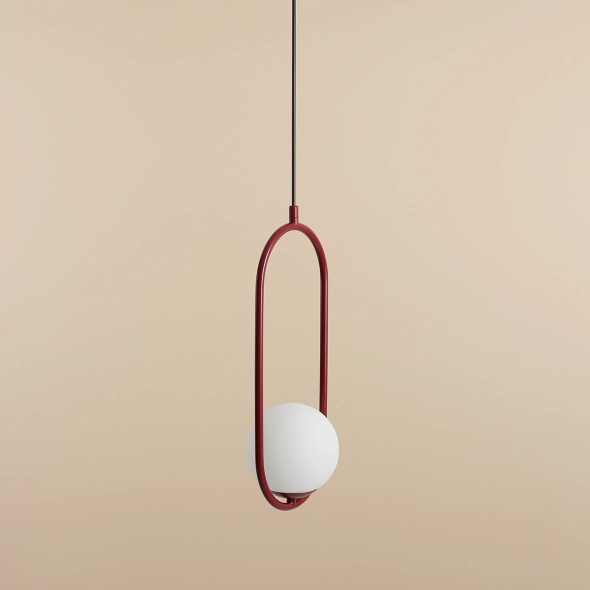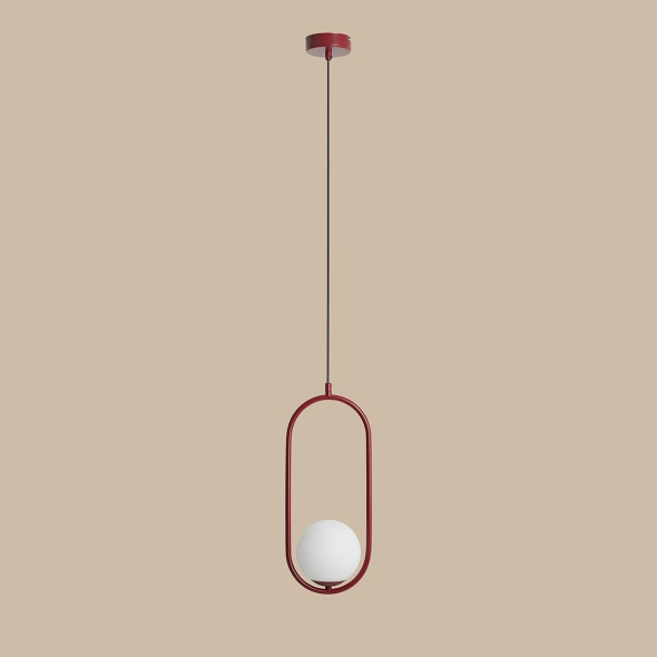 Lampa wisząca Riva sprawdzi się jako źródło światła i element dekoracyjny nowoczesnej sypialni, jadalni lub salonu. Mleczny, kulisty klosz lampy osadzony jest w metalowej, smukłej, owalnej obręczy w kolorze czerwonego wina.
