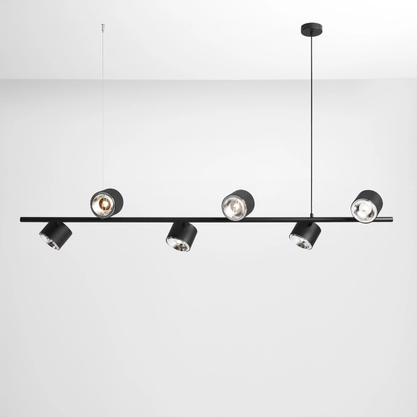 Nowoczesna lampa wisząca typu Spot, łącząca w sobie prosty design i doskonałą funkcję regulowania położenia reflektorów mocowanych na przegubach. Lampa w nowoczesnych jadalniach nad stołami, lub wyspami kuchennymi a także w salonach i biurach. Żarówki stanowią integralne wypełnienie kloszy i są dostępne do dokupienia osobno. Zalecamy stosowanie żarówek z oznaczeniem AR111 na gwint GU10.