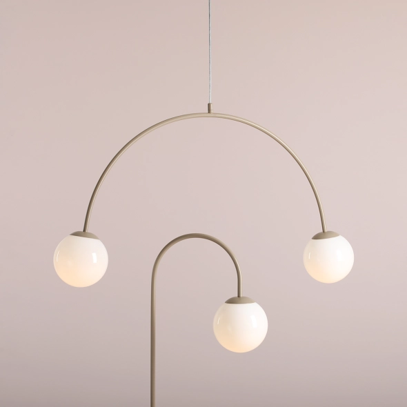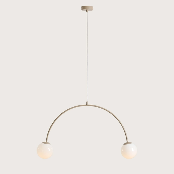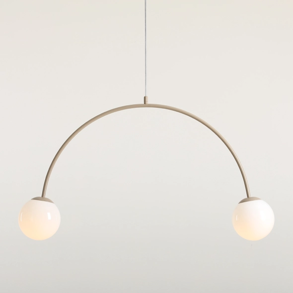 Pendelleuchte aus der UNA Kollektion mit charakteristischer Bogenform und höhenverstellbarer Aufhängung. Zwei Lichtquellen verborgen im opalweißen Glas, modernes Design und sorgfältige Verarbeitung; angenehmer Beigeton. Leuchtmittel separat erhältlich (schmal, Fassung E14).