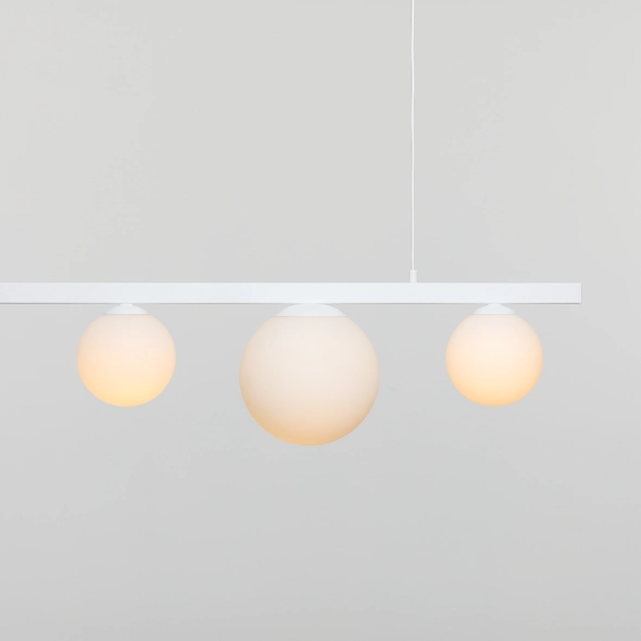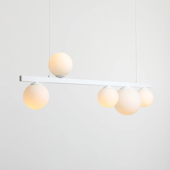 Garda 5 White ist eine stilvolle und originelle Pendelleuchte mit modernem Design, ideal zur Beleuchtung des Bereichs über dem Tisch im Wohn- oder Esszimmer. Fünf Lichtquellen in opalweißen Glaskugeln mit 14 und 20 cm Durchmesser sorgen für sanftes, stimmungsvolles Licht.