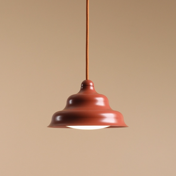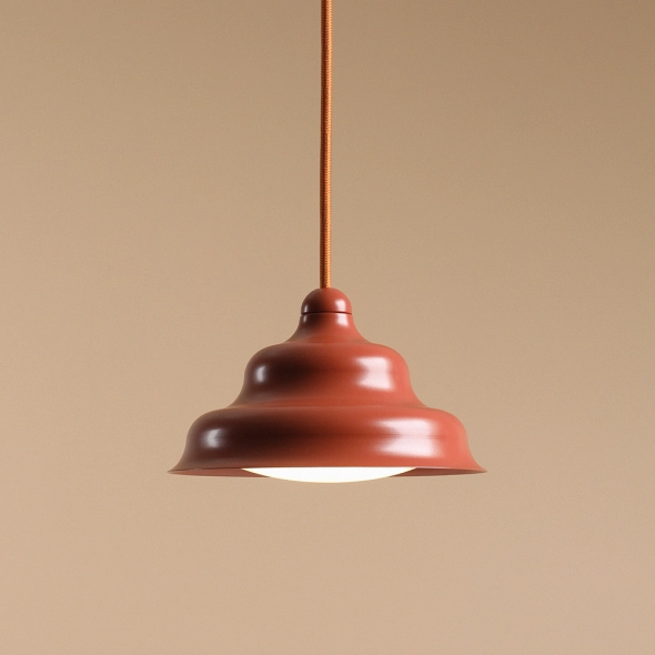 Die kleine Pendelleuchte Fala S, entworfen von Nikodem Szpunar, besticht durch ihren wellenförmigen Metallschirm in einem warmen Ziegelton mit Satin-Finish. Der Schirm ist an einem textilummantelten Kabel aufgehängt, dessen Länge individuell angepasst werden kann, und das Innere wird von einer flachen, breiten G10-Glühbirne beleuchtet (im Lieferumfang enthalten).