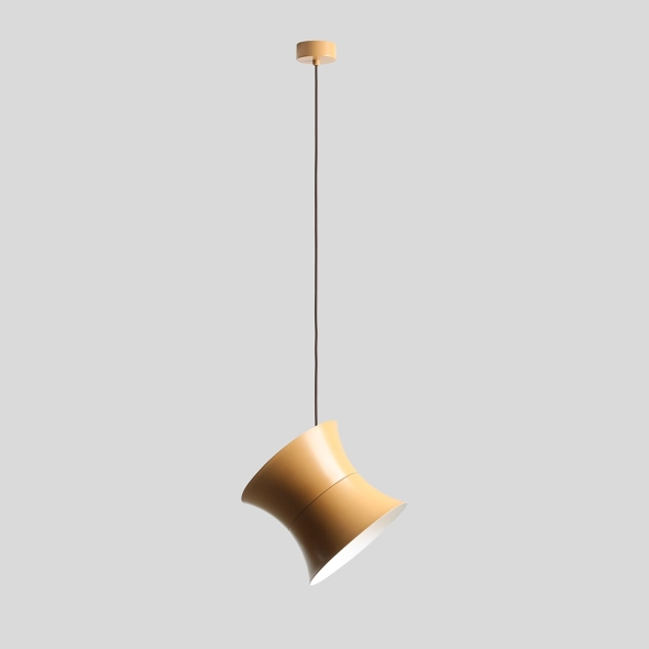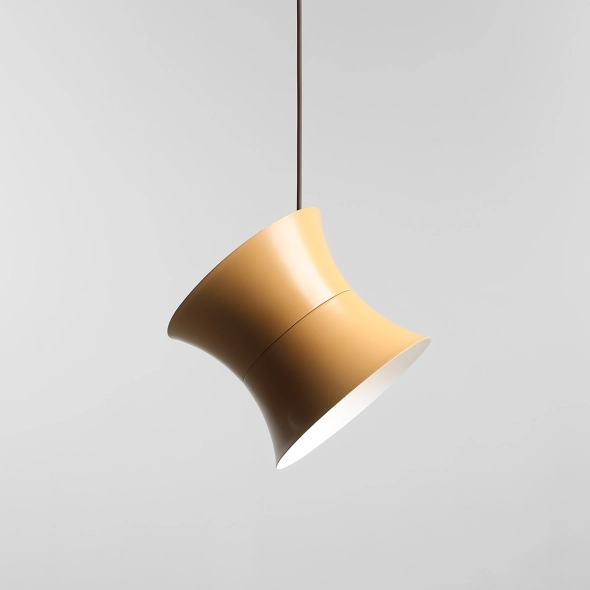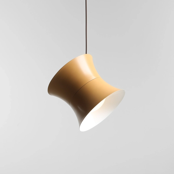 Der ockerfarbene Metallschirm mit 25 cm Durchmesser wird von einem 16 cm großen, glänzend weißen Innenschirm ergänzt, der das Licht sanft streut und eine behagliche Atmosphäre schafft. Die schlichte, geometrische Form macht die Lampe zeitlos.