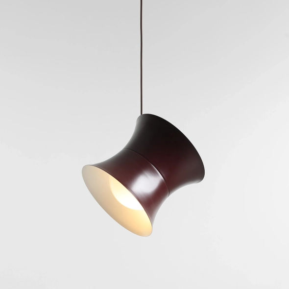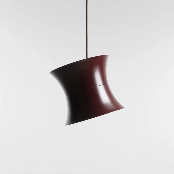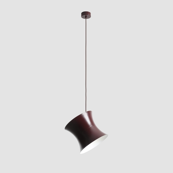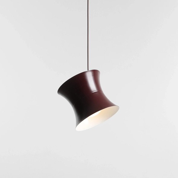 Der 25 cm große Metallschirm in intensivem Burgunderrot umschließt einen 16 cm großen, glänzend weißen Schirm, der das Licht sanft streut und ihm eine angenehme, warme Atmosphäre verleiht. Die geometrische Form und die klaren Linien erinnern an die Ästhetik der 1960er- und 1970er-Jahre und bewahren gleichzeitig ihren zeitlosen Charakter.