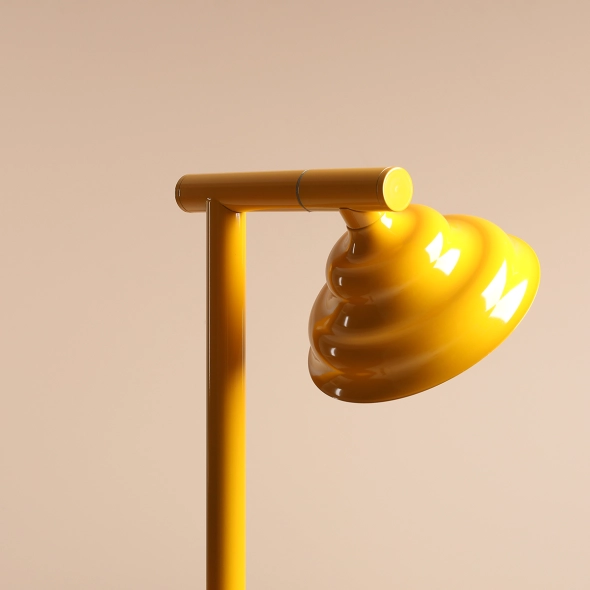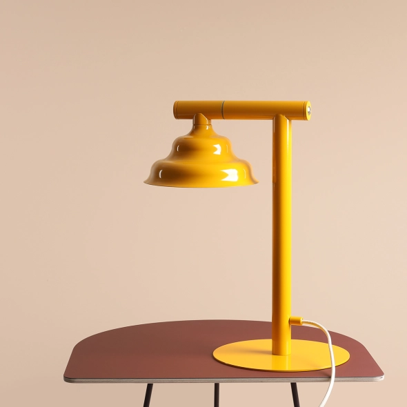 Die Schreibtischlampe Fala in intensivem Gelb mit Glanzeffekt besticht durch ihre einzigartige Konstruktion, sorgfältige Verbindungen und den wellenförmigen Schirm. Der verstellbare Schirm und der integrierte Schalter sorgen für hohe Funktionalität; GU10-Flachleuchtmittel ist inklusive.