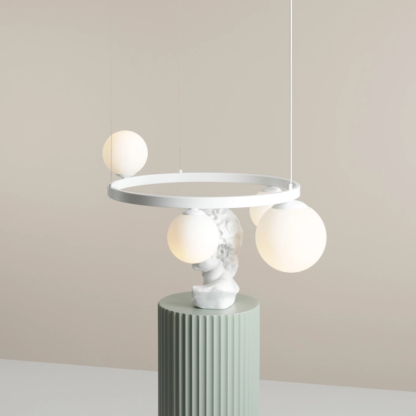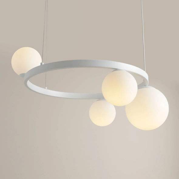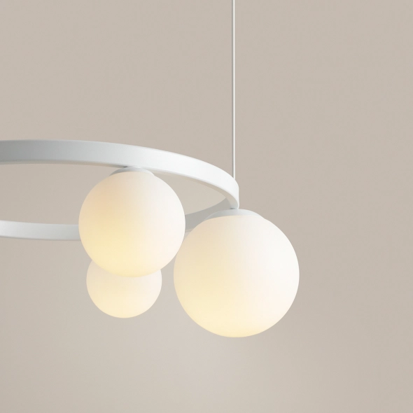 Garda 4 Ring White to stylowa i oryginalna lampa wisząca o niebanalnym, nowoczesnym designie, która pięknie rozświetli przestrzeń nad stołem w salonie lub jadalni. Chętnie wybierana również jako oświetlenie holu czy wiatrołapu. Lampa posiada cztery źródła światła, zamknięte w asymetrycznie rozłożonych na okręgu mlecznych kulach.