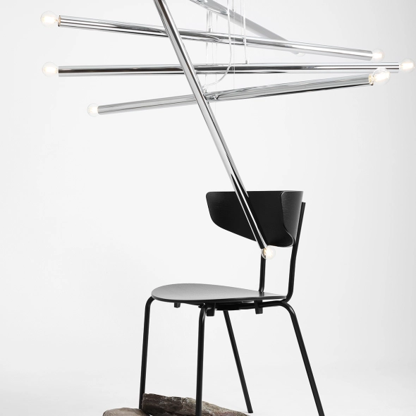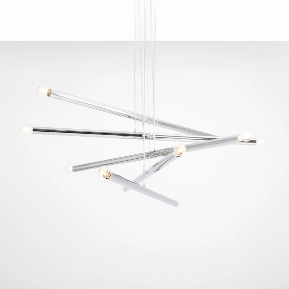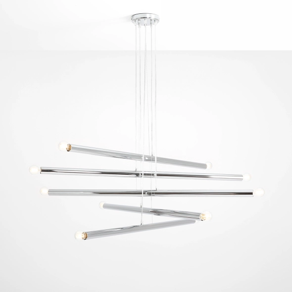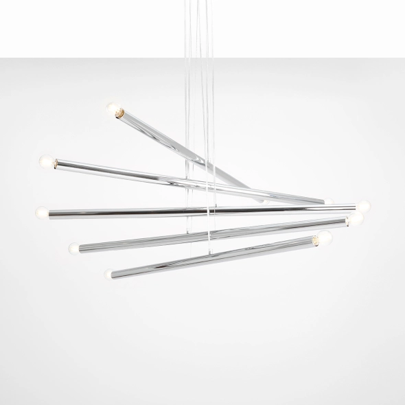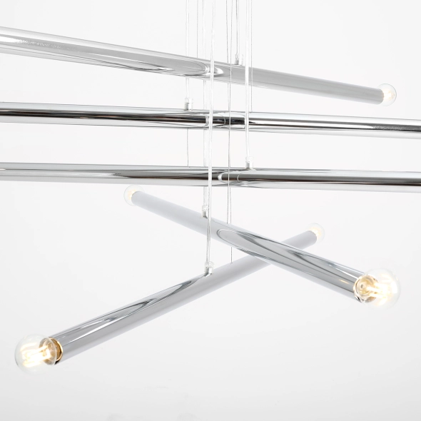 Nowoczesna lampa wisząca Tubo 10 Chrome to pięć metrowych, luźno zawieszonych w różnych kierunkach tub, zakończonych źródłem światła E14. Lampa o niebanalnej estetyce i starannym, chromowym wykończeniu. To rozwiązanie dla koneserów dobrego designu i wnętrz w stylu glamour.