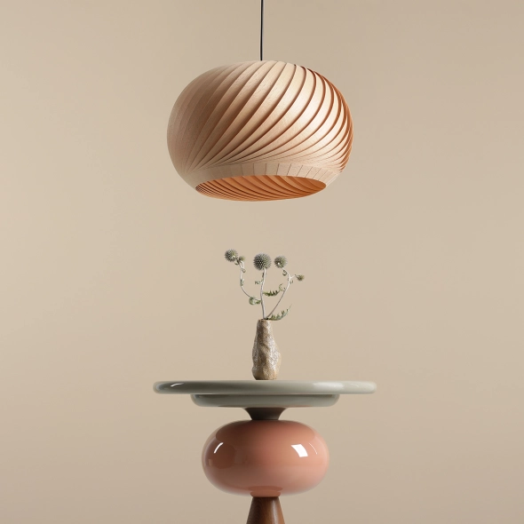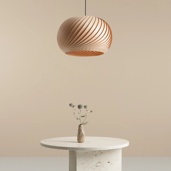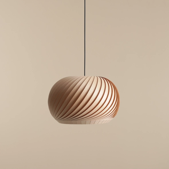 Lampa wisząca Nature Dark w rozmiarze M ze średniej wielkości abażurem (40cm) o formie kulistej rozety w intrygującym, brunatnym kolorze, która delikatnie rozproszy światło w pomieszczeniu, tworząc przyjemną i intymną atmosferę. Długi na 200cm przewód pozwala na dopasowanie wysokości lampy do własnych potrzeb. Lampa wykonana z forniru bukowego.