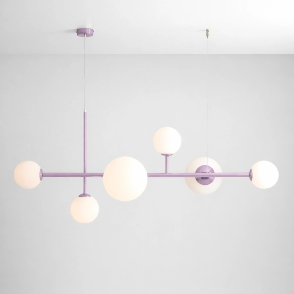 Jasnofioletowa lampa wisząca DIONE 6 LILAC to nowa odsłona bestsellerowej kolekcji DIONE. Oprawa w subtelnym, pastelowym odcieniu liliowym efektownie kontrastuje z mlecznymi kloszami ze szkła z polskiej Huty Szkła. To elegancka propozycja dla miłośników lekkich, nowoczesnych aranżacji – lampa pięknie rozprasza światło, tworząc przytulny i nastrojowy klimat nad stołem w jadalni lub w salonie. Lampa jest towarem pełnowartościowym, przecena wynika z końca produkcji koloru „Lilac.”