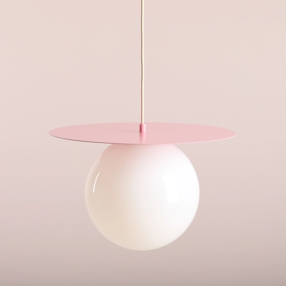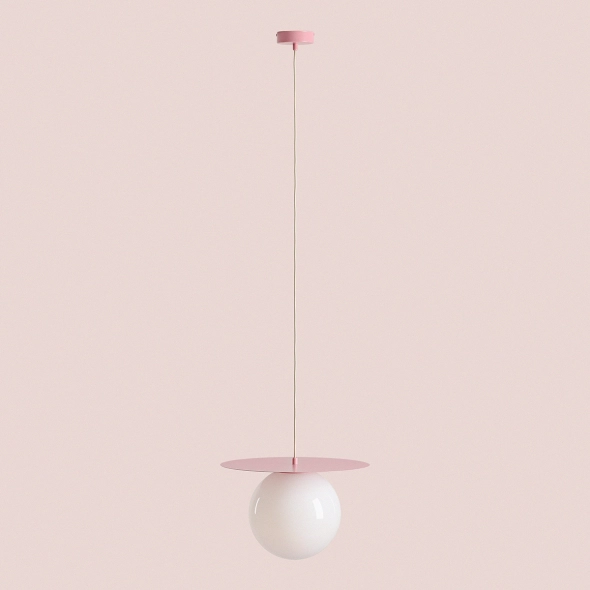 Kulista lampa wisząca z barwnym dyskiem nad kloszem, to wyraz minimalistycznego, ale efektownego designu. Lampę uszlachetnia niezwykłe, koralowe wykończenie kolorystyczne, kremowy przewód w oplocie (który z łatwością można skrócić do pożądanej długości) oraz opalowe, białe, kuliste szkło polskiej produkcji. Loop Pink w rozmiarze L to największa z proponowanych wersji lampy sufitowej. Dysk posiada 40cm, klosz 25cm.
