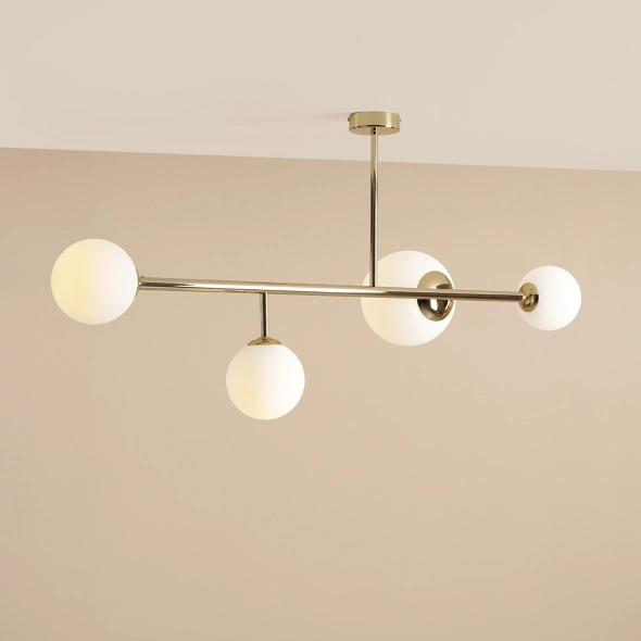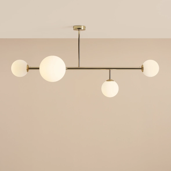 DIONE 4 GOLD to elegancka lampa sufitowa (plafon) o subtelnym, złotym wykończeniu. Cztery mleczne klosze rozpraszają światło miękko i równomiernie, tworząc przytulną atmosferę. Dzięki niewielkiej wysokości oprawa doskonale sprawdzi się w pomieszczeniach z niższym sufitem – w sypialni, przedpokoju lub salonie. Złota kolorystyka dodaje wnętrzu elegancji i ciepła!
