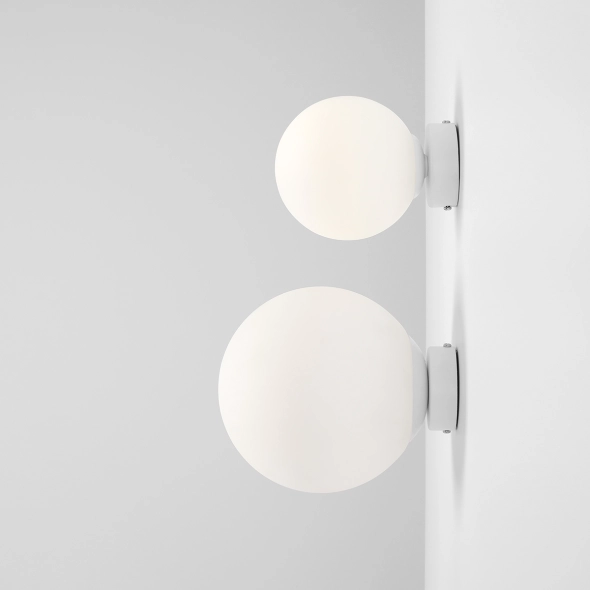 Modern wall lamp with a white matte finish and a shade diameter of 14cm.Very popular choice for side lighting of mirrors. Two sizes and four color finishes available.