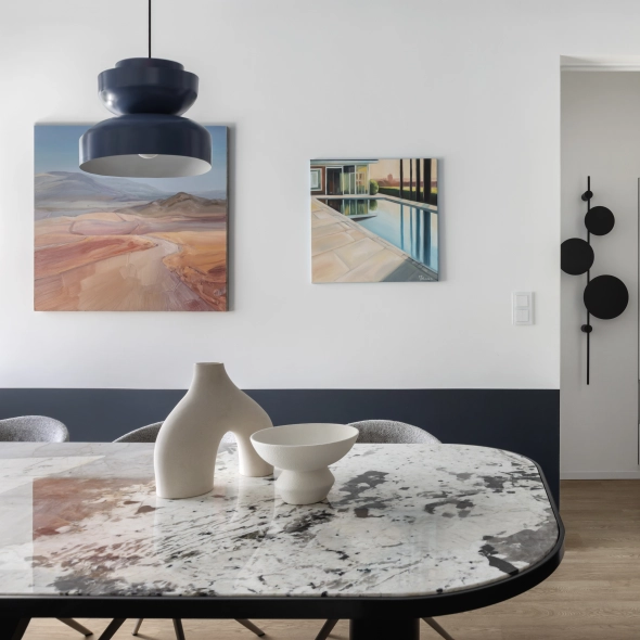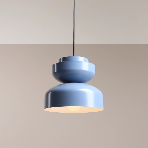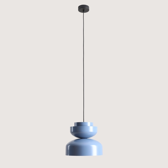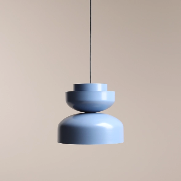 The modular Dalia pendant lamp in Dusty Blue features three different metal shades in a muted blue finish, mounted on a black or cream textile-covered cable (dark or light version). If the customer desires a different look, they can easily rearrange the shades by threading them onto the cable like beads.