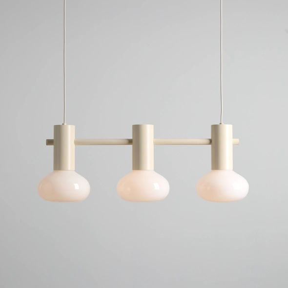 Three points of light, one consistent rhythm. FLO 3 CREAM is a composition of three creamy shades of beautiful white glass, suspended from a precisely designed bridge. Their soft light brings an atmosphere of peace and harmony to the interior - like a morning glow enveloping the space. The minimalist form inspired by nature and the light tones make it an ideal choice over a long table, a kitchen island or a spacious hall. It's an ideal proposition for those who appreciate balanced design and the warmth of light!