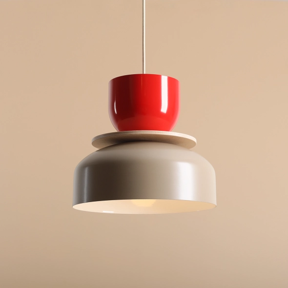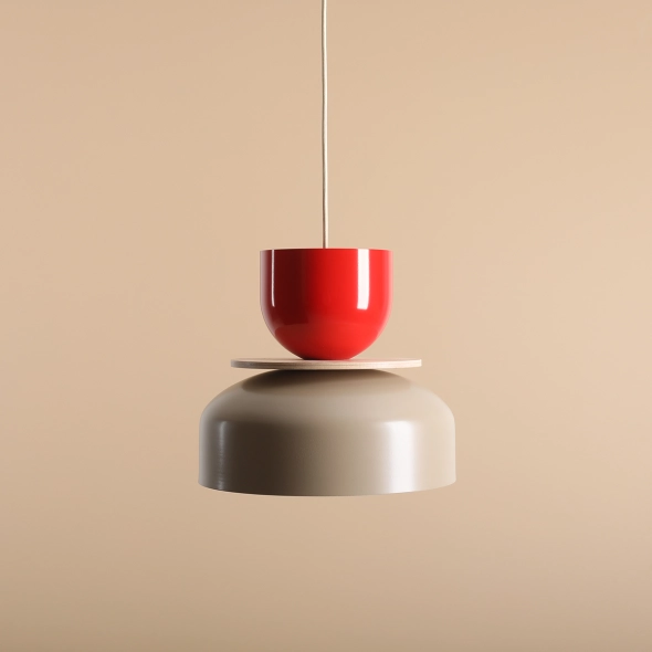 Efektowna lampa wisząca złożona z trzech modułów, z których dwa to metalowe klosze w różnych rozmiarach oraz dysk z jasnej sklejki brzozowej. Kolejność założenia elementów jest dowolna. Całość łączy kremowy lub czarny przewód w oplocie zakończony oprawką na gwint E27. Niewątpliwymi zaletami lampy są łatwość konstrukcji i zdecydowane, modne barwy.