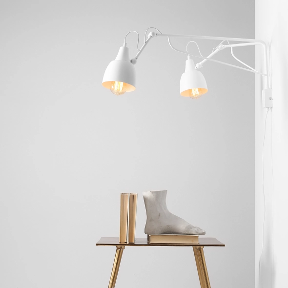 Podwójny kinkiet z serii SOHO, to dwa ramiona o różnej długości, które możemy dowolnie rozstawić względem siebie. Dodatkowo każde ramię posiada dwa przeguby pozwalające ustawić klosz pod dowolnym kątem. Obie funkcje czynią ten model niezwykle użytecznym i lubianym.