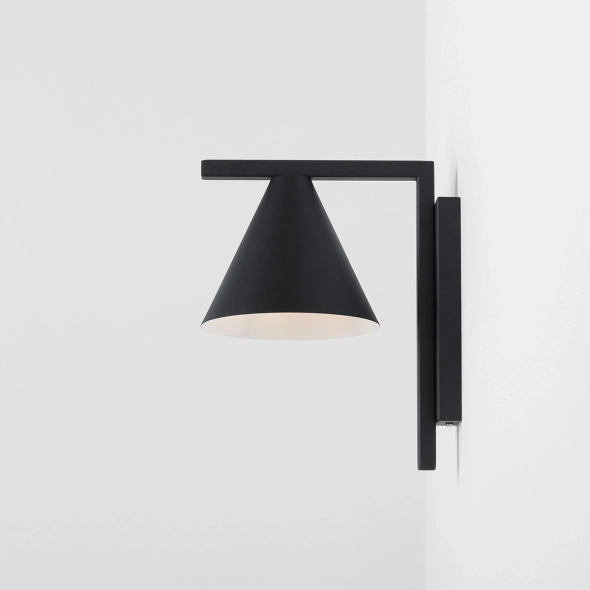 Geometryczny kinkiet Form Wall Black to elegancka lampa ścienna w intensywnie czarnym, matowym wykończeniu. Stożkowy metalowy klosz z białym wnętrzem szeroko i równomiernie rozprasza światło, dzięki czemu kinkiet doskonale sprawdzi się jako oświetlenie pomocnicze w salonie, korytarzu czy sypialni. Prosta forma i mocny kolor nadają mu uniwersalnego, nowoczesnego charakteru.