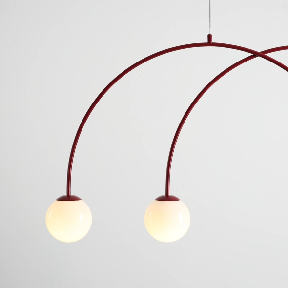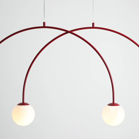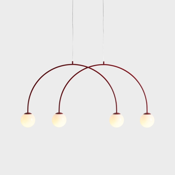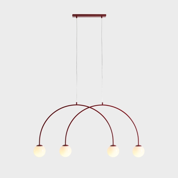 L’originale lampada a sospensione Una 4 Red Wine con finitura satinata colpisce per il moderno motivo ad arco e il profondo colore bordeaux, che dona eleganza e carattere all’ambiente. I paralumi bianchi da 14 cm diffondono dolcemente la luce, creando un’atmosfera accogliente; con una larghezza di 130 cm e altezza regolabile, è ideale per la sala da pranzo, il salotto o una camera da letto raffinata.