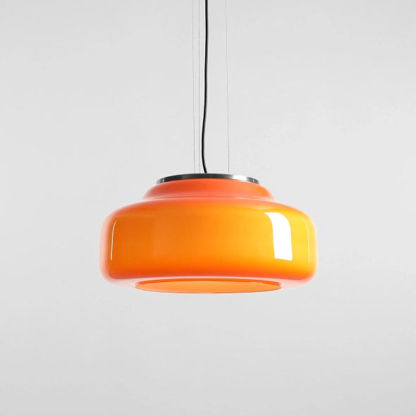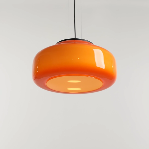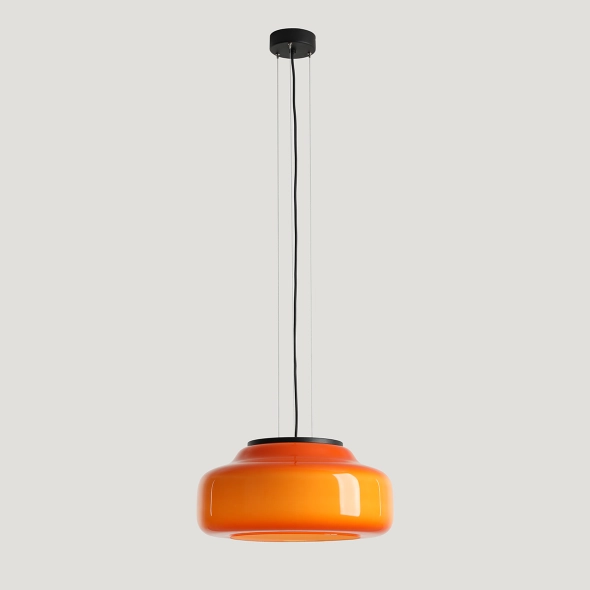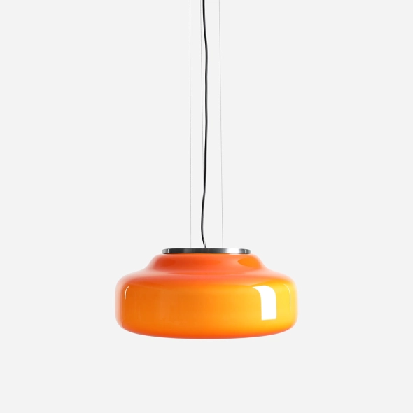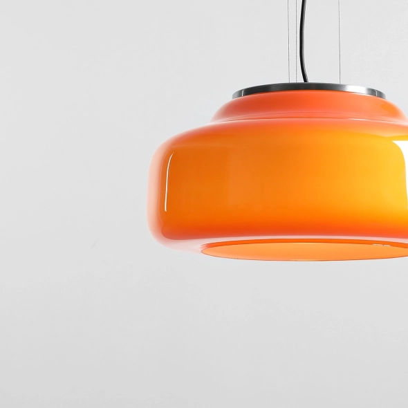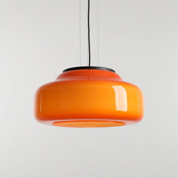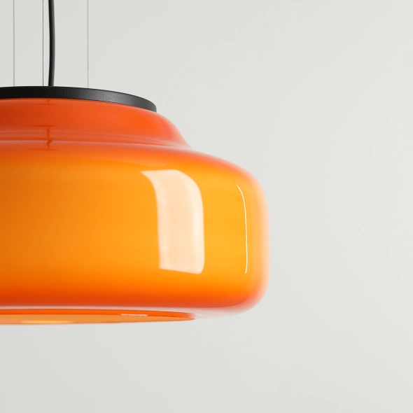 La nuova versione della lampada BONBON 2.0 L ORANGE (diametro 40 cm), disegnata da Mikołaj Nicer (Nicer Design), ha una forma ancora più leggera ed enfatizza l'eleganza del vetro soffiato a mano. Il paralume in vetro opalino di un intenso arancione dona energia e calore all'ambiente, creando una luce piacevole e tonificante. Grazie alla delicata finitura interna, la lampada emette una luce uniforme che ne esalta magnificamente il colore. È la scelta ideale per bar, soggiorni o spazi commerciali decorativi.