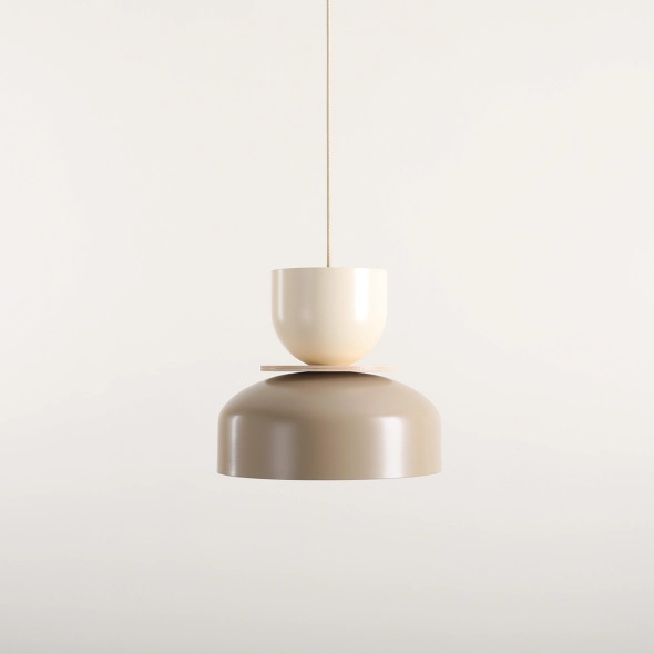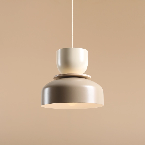 La lampada a sospensione Uto è composta da tre moduli indipendenti, rifinita in piacevoli tonalità beige e crema. L'interno del grande paralume è bianco per una luce intensa e uniforme; il cavo in tessuto color crema o nero è regolabile in lunghezza.