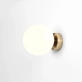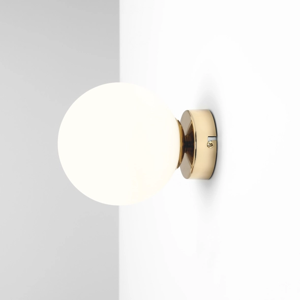 Kinkiet BALL 1 GOLD (14 cm) to kompaktowa wersja eleganckiej lampy w złotym wykończeniu. Mleczny klosz o średnicy 14 cm zapewnia delikatne, ciepłe światło. Idealny jako oświetlenie pomocnicze przy lustrze, w sypialni lub holu. Świetnie komponuje się z innymi lampami z kolekcji BALL.