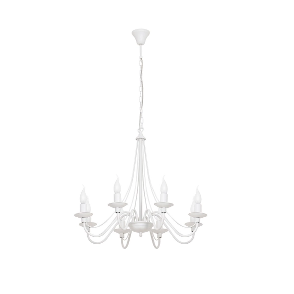 Ośmioramienny żyrandol RÓŻA 8 WHITE to ponadczasowa lampa w stylu świecznikowym, malowana na elegancki biały mat. Delikatna, a zarazem wyrazista forma sprawia, że żyrandol doskonale rozświetla przestrzeń i staje się jej centralnym punktem dekoracyjnym. To idealny wybór do klasycznych jadalni, rustykalnych salonów oraz wnętrz w stylu prowansalskim. Kolekcja RÓŻA oferuje także kinkiety, lampy stołowe i podłogowe, dzięki czemu można stworzyć spójną aranżację oświetleniową w całym wnętrzu.