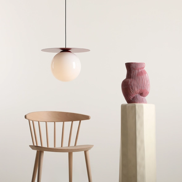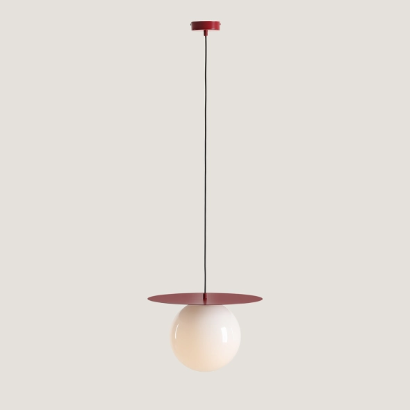 Największa lampa wisząca z kolekcji Loop marki Artera. Kulista lampa z bordowym dyskiem nad kloszem, to wyraz minimalistycznego, ale efektownego designu. Lampę uszlachetnia niezwykłe, koralowe wykończenie kolorystyczne, przewód w oplocie (który z łatwością można skrócić do pożądanej długości) oraz opalowe, białe, kuliste szkło polskiej produkcji. Idealnie sprawdzi się nad stołem w jadalni lub w centralnym punkcie salonu lub w przestrzeni użyteczności publicznej jako lampa do kawiarni lub restauracji
