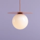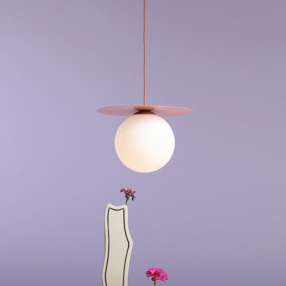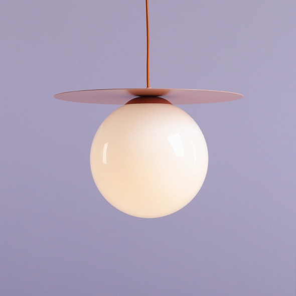 Kulista lampa wisząca z barwnym dyskiem nad kloszem, to wyraz minimalistycznego, ale efektownego designu. Lampę uszlachetnia niezwykłe, koralowe wykończenie kolorystyczne, przewód w oplocie (który z łatwością można skrócić do pożądanej długości) oraz opalowe, białe, kuliste szkło polskiej produkcji. Loop Coral w rozmiarze L to największa z proponowanych wersji lampy sufitowej. Dysk posiada 40cm, klosz 25cm.