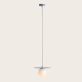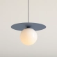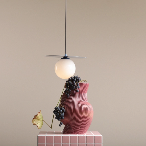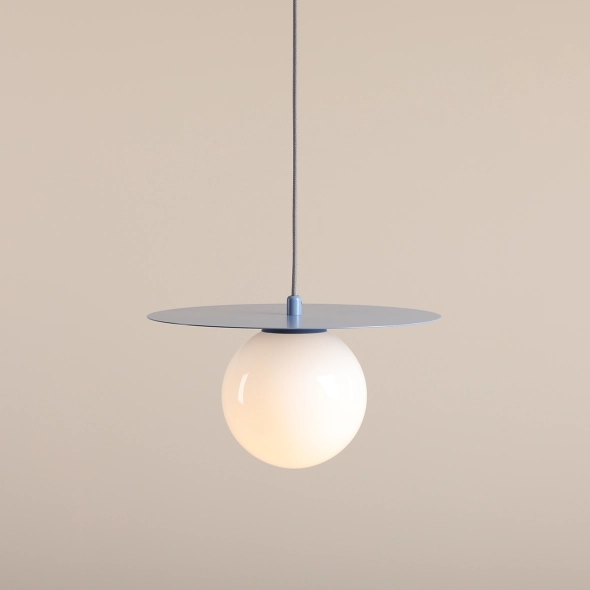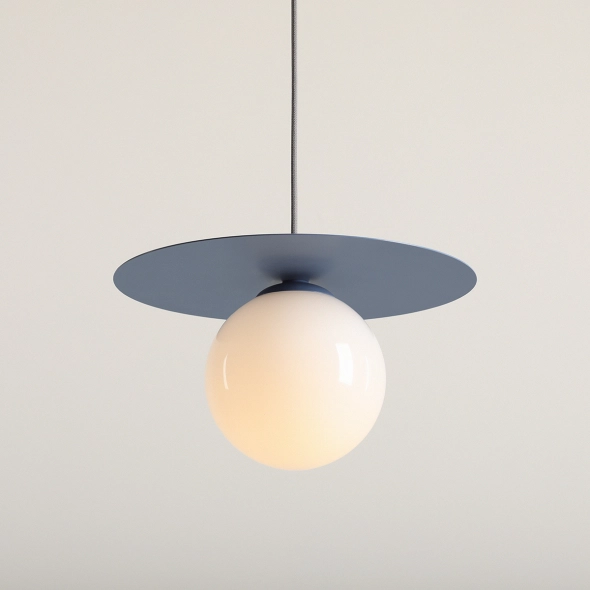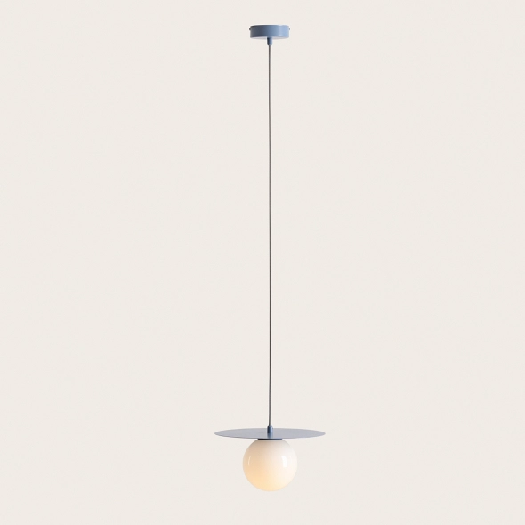 Lampa wisząca w przyjemnym, zgaszonym niebieskim odcieniu, o ciekawej, nowoczesnej bryle. Lampa równomiernie oświetla przestrzeń, nadając wnętrzu subtelny akcent kolorystyczny. Szklana, opalowa kula zwieńczona jest dyskiem w delikatnie matowym wykończeniu. Możliwość skrócenia przewodu w tekstylnym oplocie zapewnia wygodę w aranżacji.