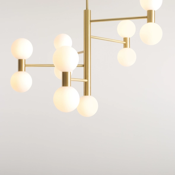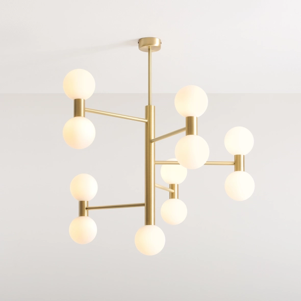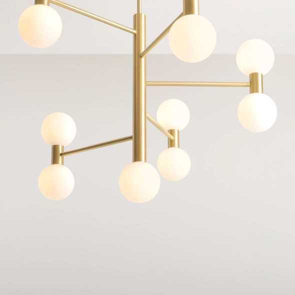 Lampa sufitowa Flare z jedenastoma równomiernie rozłożonymi wokół osi niewielkimi, mlecznymi kulami, to wyjątkowo estetyczna i bardzo dobrze oświetlająca przestrzeń oprawa. Projekt jest bardzo lekki i przyjemny, pozwala usytuować lampę w wielu wnętrzach, od salonów i jadalni urządzonych w klasycznych trendach, po miejsca użyteczności publicznej. Szlachetny materiał, przestrzenna konstrukcja i dobre światło to niewątpliwe zalety tej lampy.