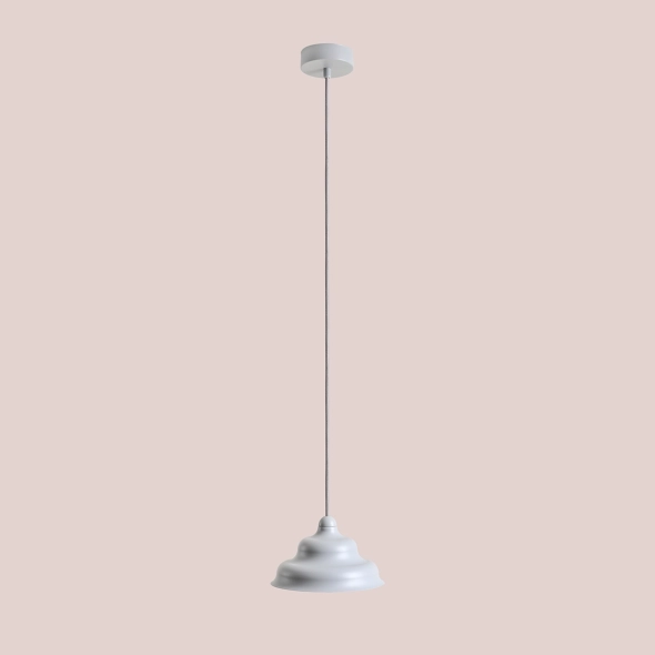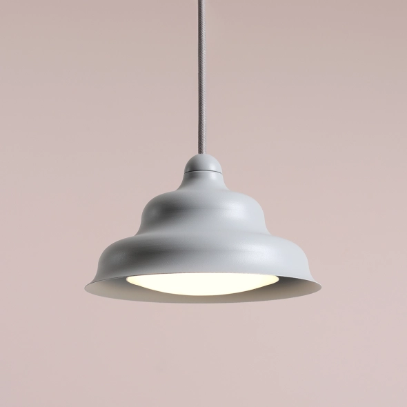 Niewielka lampa wisząca Fala S projektu Nikodema Szpunara, to pojedyncza lampa o płynnych załamaniach metalowego klosza, w uniwersalnym szarym, satynowym wykończeniu. Fala to oprawa o ciekawej bryle, która będzie spełniać funkcję praktyczną oraz dekoracyjną. Klosz zawieszony na przewodzie w tekstylnym oplocie w kolorze oprawy (długość można samodzielnie dopasować do potrzeb). Jego wnętrze wypełnia płaska, szeroka żarówka na gwint G10 (w zestawie do lampy).