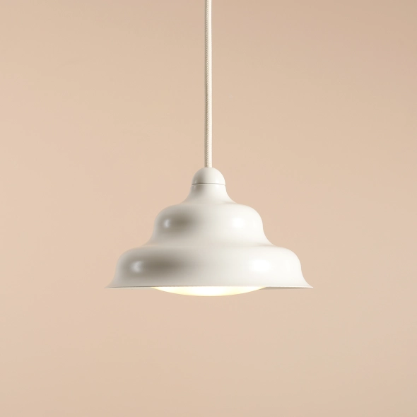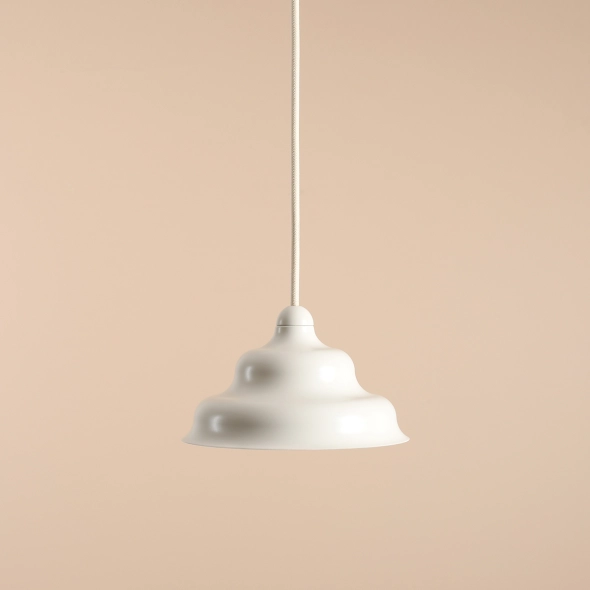 Niewielka lampa wisząca Fala S projektu Nikodema Szpunara, to pojedyncza lampa o płynnych załamaniach metalowego klosza, w pięknym kremowym, satynowym wykończeniu. Fala to oprawa o ciekawej bryle, która będzie spełniać funkcję praktyczną oraz dekoracyjną. Klosz zawieszony na przewodzie w tekstylnym oplocie w kolorze oprawy (długość można samodzielnie dopasować do potrzeb). Jego wnętrze wypełnia płaska, szeroka żarówka na gwint G10 (w zestawie do lampy).