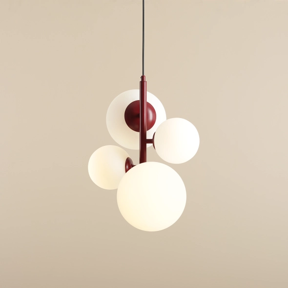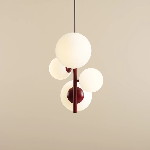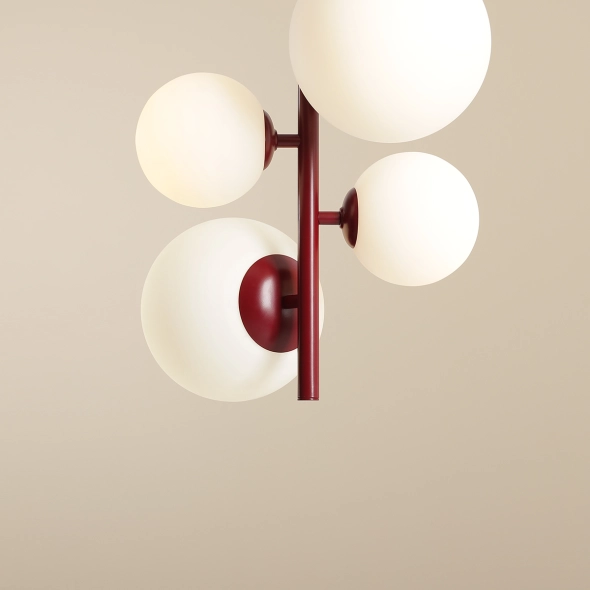 Nowoczesna lampa wisząca Bloom Red Wine to modne i efektowne oświetlenie, dające przyjemne światło i niezapomniane wrażenie. Lampa, dzięki zastosowaniu czterech źródeł światła (matowe, białe klosze w dwóch rozmiarach: 14cm i 20cm), pięknie rozświetli przestrzeń, w której się znajduje. Polecamy do zawieszenia nad stołem. Lampa oprócz swojej funkcji będzie również dekoracją, wprowadzającą niepowtarzalny klimat podczas posiłku.