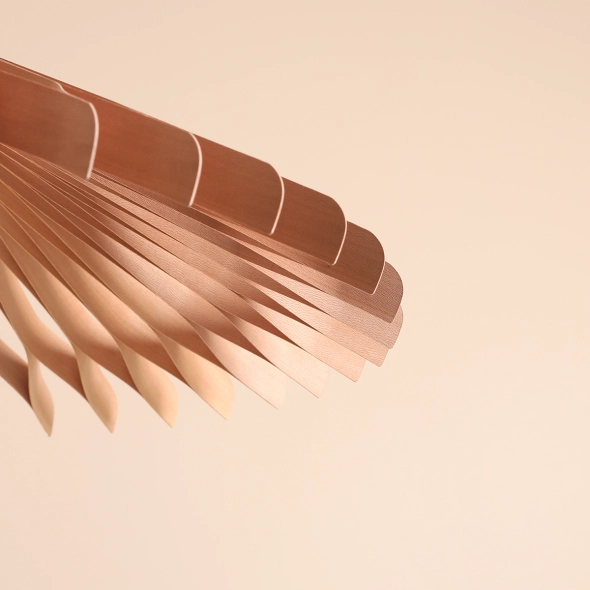 Lampa Nature Sun o największej średnicy - 70cm i wysokości stożka 25cm. Lampa budzi skojarzenie szeroko rozpostartego nad stołem parasola, a przenikające ażur światło, pięknie układa się we wnętrzu. Abażur otulający klosz został skomponowany z pasków forniru z bukowego drewna i zabezpieczony specjalnym eko lakierem UV, który chroni go przed zmianą koloru pod wpływem promieni słonecznych. Nature Sun idealnie nadaje się do oświetlania otoczenia w salonach i sypialniach, zapewnia dobre światło i przyjemny klimat we wnętrzu.