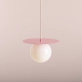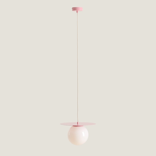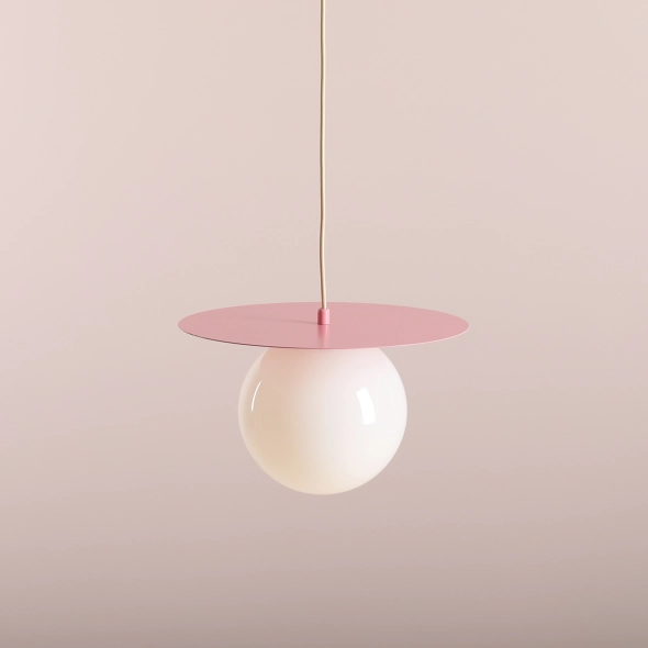 LOOP Baby Pink to lampa wisząca o delikatnym różowym odcieniu, idealna do wnętrz o subtelnym, romantycznym charakterze. Metalowy dysk o średnicy 34 cm i opalowy, kulisty klosz z polskiego szkła tworzą efektowną i harmonijną całość. Przewód w oplocie umożliwia regulację długości, co czyni lampę uniwersalnym rozwiązaniem do różnych aranżacji. Wariant Baby Pink w rozmiarze M doskonale sprawdzi się w salonach, sypialniach czy pokojach dziecięcych. Na życzenie dostępna jest wersja z matowym szkłem.