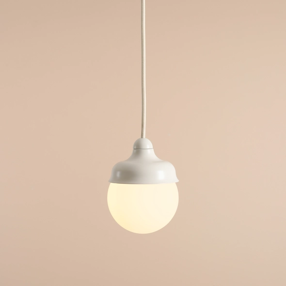 Urokliwa lampka wisząca Fala XS projektu Nikodema Szpunara, znajdująca zastosowanie w niewielkich przestrzeniach wymagających doświetlenia np. boki czy wezgłowia łóżek, blaty, oświetlenie boczne luster. Lampki mogą być używane samodzielnie lub w wielu kompozycjach. Wyjątkowo przyjemny, kremowy kolor w satynowym wykończeniu, metalowy falisty daszek okrywający mleczną kulkę i starannie dobrany sznur w oplocie, to zalety tej oprawy. Produkt wykonany we własnym parku maszynowym.