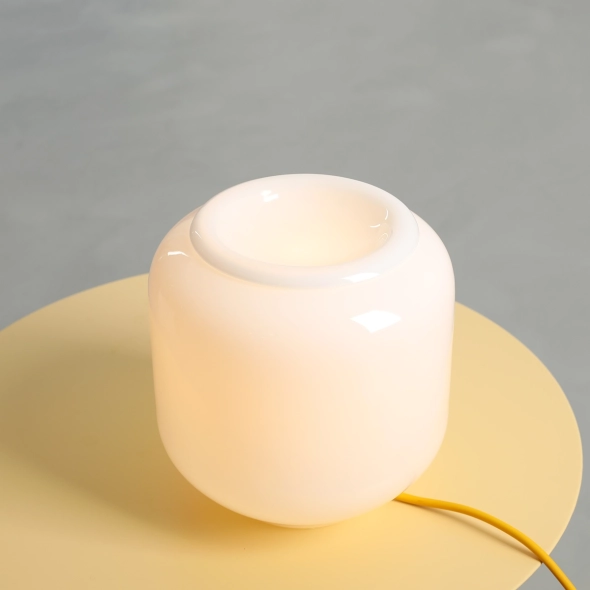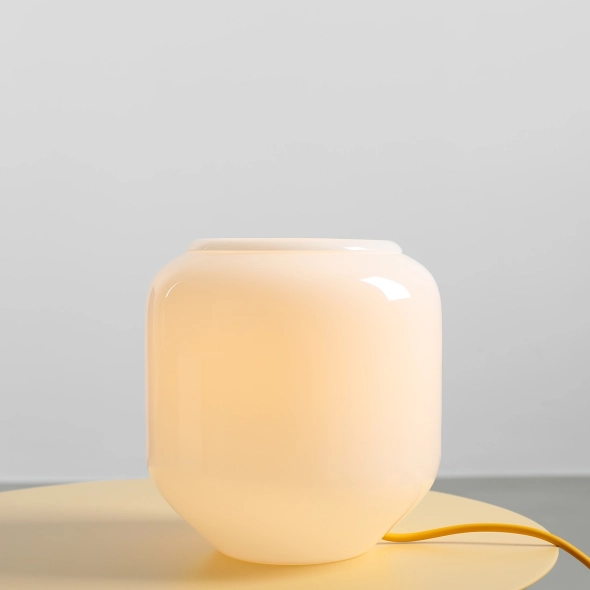 FLASK TABLE S MIMOSA (proj. Mikołaj Nicer / Nicer Design) to mała, minimalistyczna lampa biurkowa, w której miękkie światło opalowego szkła spotyka się z radosnym detalem koloru. Mlecznobiały klosz rozprasza światło przyjemnie i równomiernie, a po włączeniu zyskuje cieplejszy odcień. Górny szklany „talerzyk” osłania źródło światła, zmniejszając efekt rażenia. Energetyczny żółty kabel z włącznikiem działa niczym mały „przycisk optymizmu” we wnętrzu - bez przesady, za to z charakterem. Ø18 cm sprawia, że lampa świetnie pasuje na biurko, komodę lub stolik pomocniczy. W zestawie znajduje się wymienne źródło światła E14.