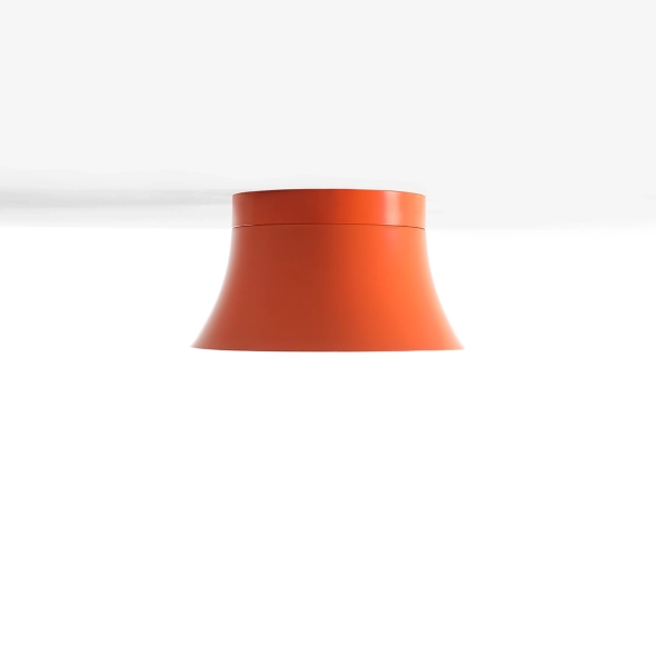 Kibo Flare S to kompaktowy plafon, który wchodzi do wnętrza jak odważny detal projektowy: krótka, solidna forma i intensywny pomarańcz Flare. Szeroka bryła ma w sobie „masę” i architektoniczną pewność, a jednocześnie pozostaje minimalistyczna i czysta w odbiorze. Klosz otwiera się ku dołowi, dzięki czemu światło jest miękkie, uporządkowane i kierunkowe - przyjemne na co dzień, bez ostrości.