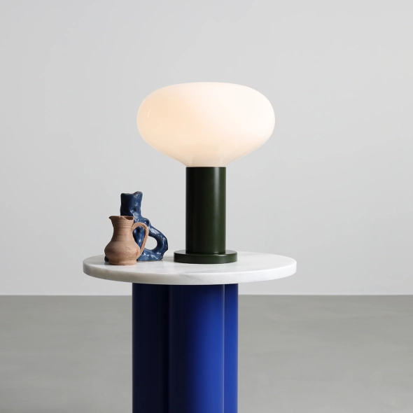 Minimalistyczna lampa biurkowa w kolorze głębokiej zieleni FLO TABLE MOSS M proj. Sedno Studio