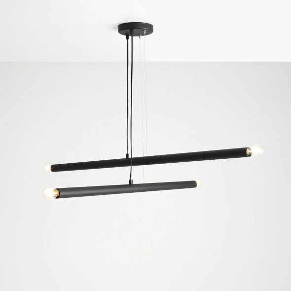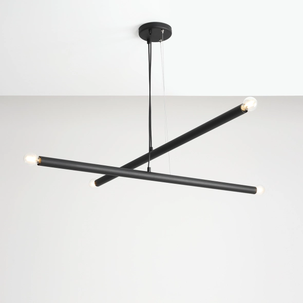 Nowoczesna lampa wisząca Tubo 4 Black to dwie metrowe, luźno zawieszone w różnych kierunkach tuby, zakończone źródłem światła E14. Lampa o niebanalnej estetyce. To rozwiązanie dla koneserów dobrego designu i minimalistycznych wnętrz.