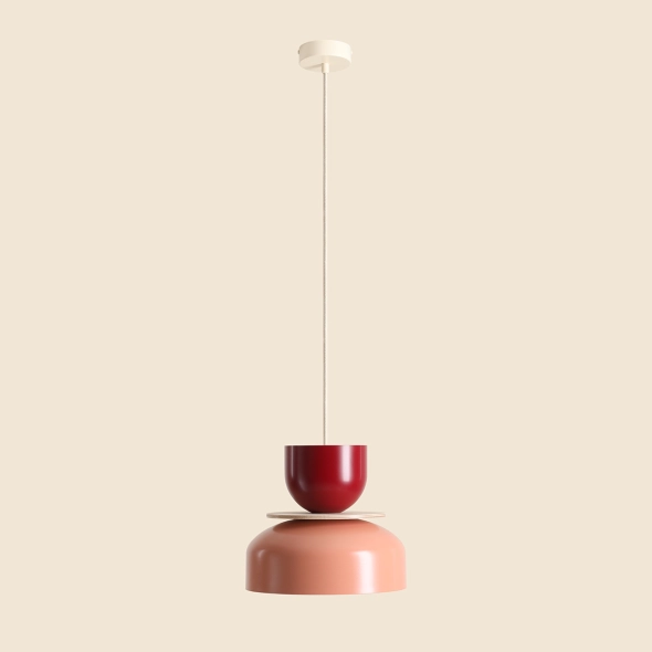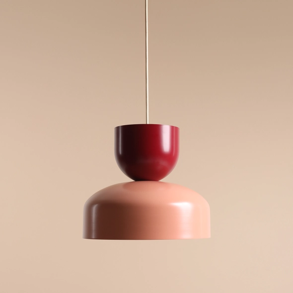 Lampa Uto w wyjątkowym zestawieniu kolorystycznym Coral/Red Wine. Duży klosz w odcieniu ciepłej, koralowej czerwieni (średnica 30 cm) pięknie kontrastuje z mniejszym, głębokim bordowym kloszem (średnica 15 cm). Elegancji dodają jasne detale: dekoracyjny drewniany dysk (można go pominąć przy montażu), oraz kabel w wybranym kolorze - kremowy lub czarny. Lampa Uto Coral/Red Wine doskonale odnajdzie się w nowoczesnym salonie, przytulnej sypialni lub nad stołem w jadalni, stając się centralnym punktem każdego wnętrza.
