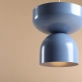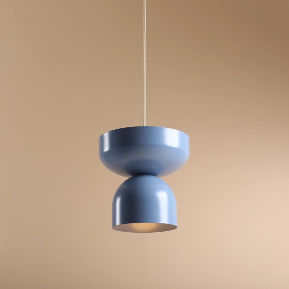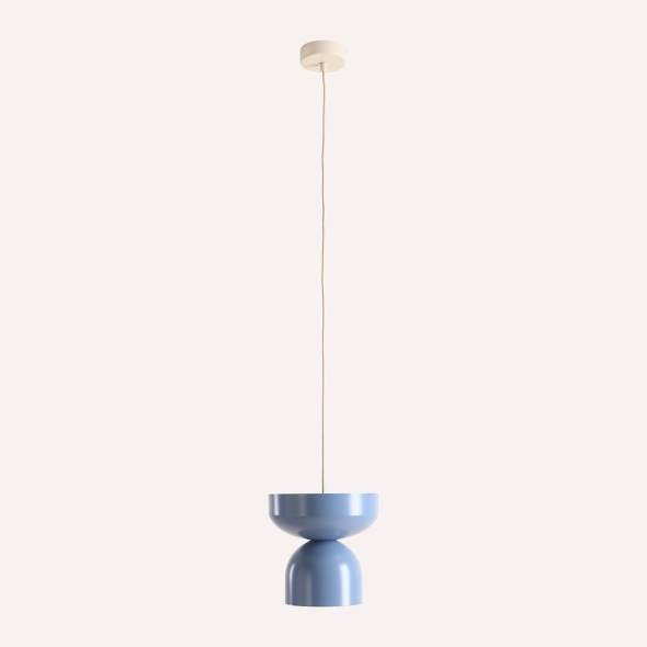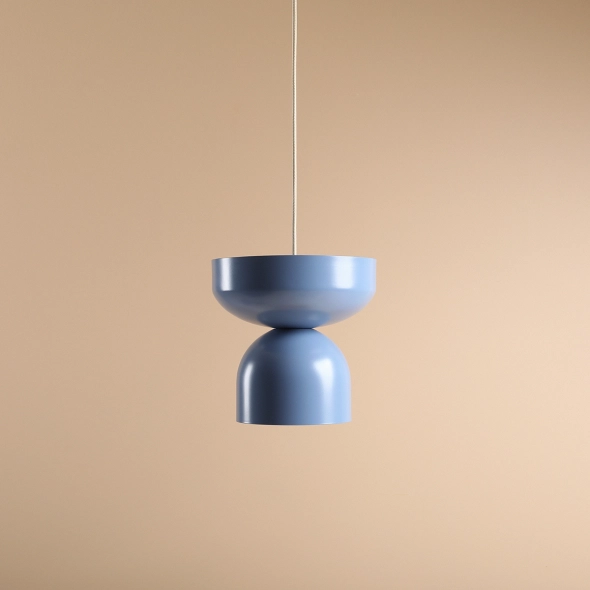 Lampa wisząca skomponowana z dwóch niebieskich modułów. Elementy można złączyć w dowolnej kolejności, umieszczając dużą misę na dole lub na górze. Finałowy efekt zależy od preferencji klienta dzięki możliwości personalizacji koloru kloszy, ich ułożenia oraz koloru kabla.