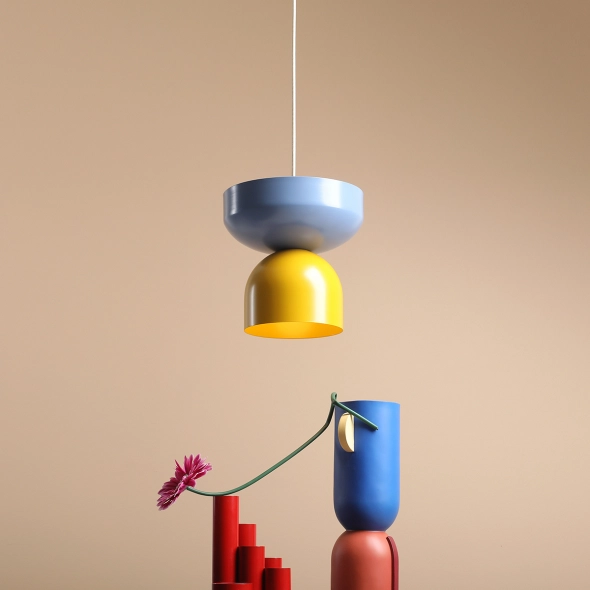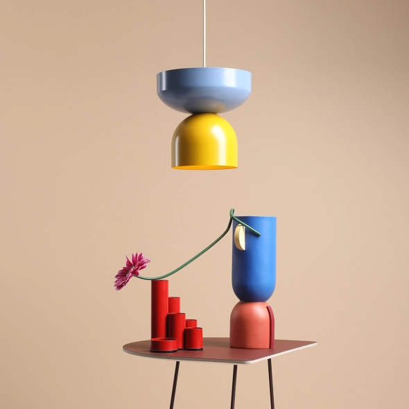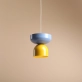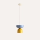 Lampa wisząca skomponowana z dwóch modułów: niebieskiego i jasnej musztardy. Elementy można złączyć w dowolnej kolejności, umieszczając dużą misę na dole lub na górze. Lampy API nie posiadają drewnianego dysku w komplecie - znajdą go Państwo w modelach UTO.