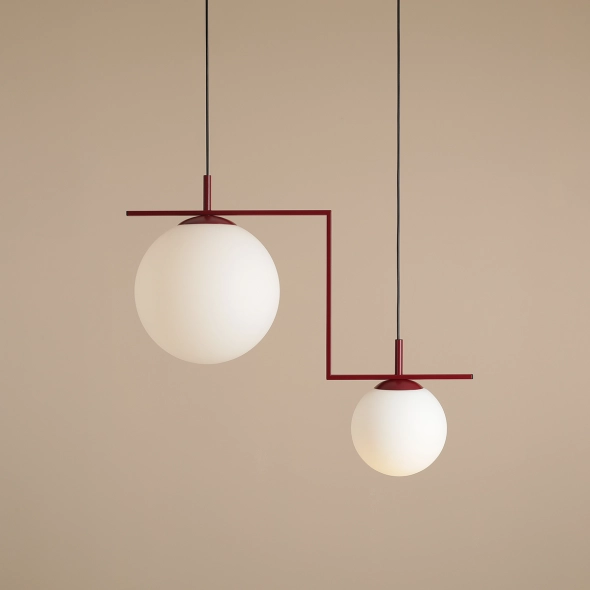 Dwukulowa lampa wisząca Zac w wyjątkowym odcieniu czerwonego wina łączy nowoczesny design z funkcjonalnością. Wykonana z wysokiej jakości matowego szkła, świeci miękko i równomiernie.