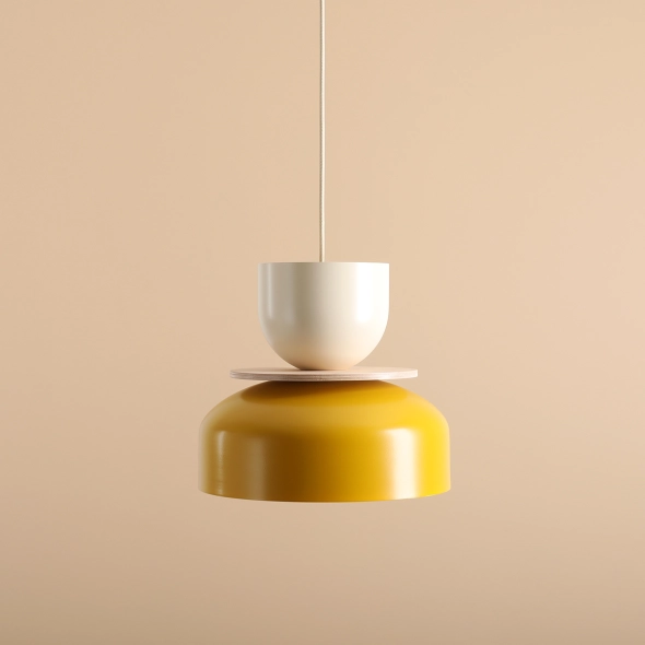 Efektowna lampa wisząca złożona z trzech modułów, z których dwa to metalowe klosze w różnych rozmiarach oraz dysk z jasnej sklejki brzozowej. Kolejność założenia elementów jest dowolna. Całość łączy przewód w oplocie zakończony oprawką na gwint E27. Niewątpliwymi zaletami lampy są łatwość konstrukcji i piękne barwy.