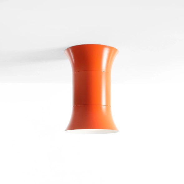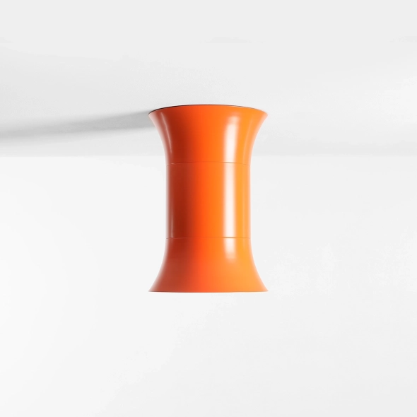 Kibo Flare L to mocny akcent w kolekcji: intensywny pomarańcz Flare i szeroka, „pełna” bryła, która pozwala kolorowi wybrzmieć w najlepszy sposób. Krótka, solidna forma działa jak świadomy element architektury sufitu - przyciąga uwagę, ale pozostaje konsekwentnie minimalistyczna. Klosz otwierający się ku dołowi daje miękkie, kontrolowane światło, które buduje atmosferę bez ostrego kontrastu.