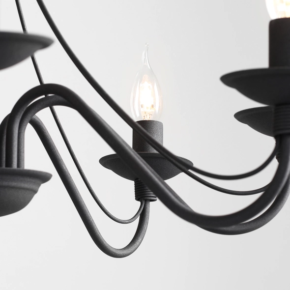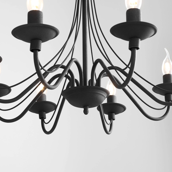 Żyrandol RÓŻA 8 BLACK to klasyczny, ośmiopłomienny świecznik w eleganckim, czarnym wykończeniu. Dzięki swojej rozłożystej formie pięknie wypełnia przestronne wnętrza, takie jak salony, jadalnie czy hotelowe hole. Ponadczasowy kształt ramion sprawia, że lampa świetnie odnajdzie się zarówno w tradycyjnych, jak i nowoczesnych aranżacjach, wprowadzając do wnętrza klimat elegancji i szyku.